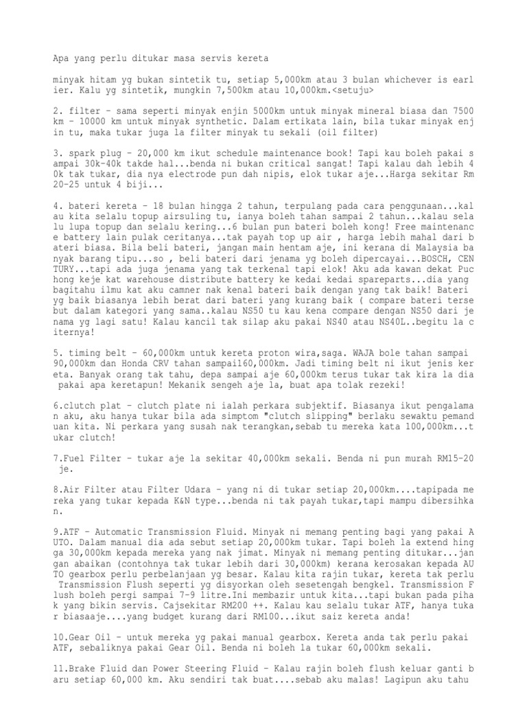 Jadi anda hanya perlu menukar timing belt mengikut jenis kenderaan yang anda gunakan. Untuk kereta manual, sila ingat kembali bila last tukar clutch plate. Memandu sebuah kereta automatik untuk naik bukit adalah amat mudah. Susah nak terangkan sebab ada yang kata bila 100,000 km baru kena tukar clutch. Bila sampai masa untuk saya tukar tayar kereta, biasanya saya akan pergi kunjung beberapa kedai tayar dan buat pertanyaan. Minyak hitam yang bukan jenis sintetik perlu ditukar pada setiap perjalanan menjangkau 5,000km atau selama 3 bulan. Tukar aje la sekitar 40,000 km sekali. Tukar je bila dah sekitar 40,000 km sekali. Cikgu, saya nak bertanya, bagaimana memandu ketika jalan sesak di kawasan yang berbukit, apabila berhenti, saya akan tekan break dan clutch, tapi bila kereta nak bergerak semula , saya nak lepaskan break untuk tekan minyak, kereta pun mengundur ke belakang sebelum saya sempat tekan pedal minyak. Apa yang perlu ditukar masa servis kereta. Clucth plate ni perkara subjektif. Kalau anda rajin tukar, kereta anda tidak perlu transmission flush seperti yg disyorkan oleh sesetengah bengkel. Ramai orang tak tahu,sampai saja 60,000 km mereka terus tukar tak kiralah pakai kereta apa pun.